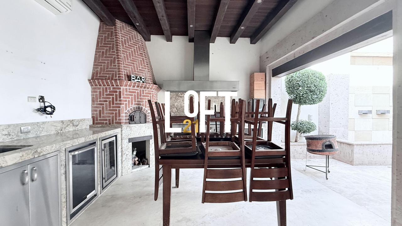 Sala y comedor comunicados con la cocina en espacios abiertos con vista al bar en el exterior el cual cuenta con electrodomésticos de alta gama, asador , horno, conectado en espacio habierto con el patio el cual tiene cascada y acabados en cantera